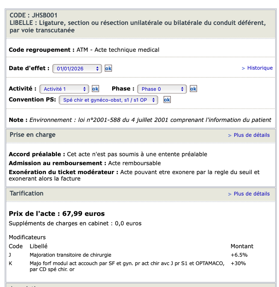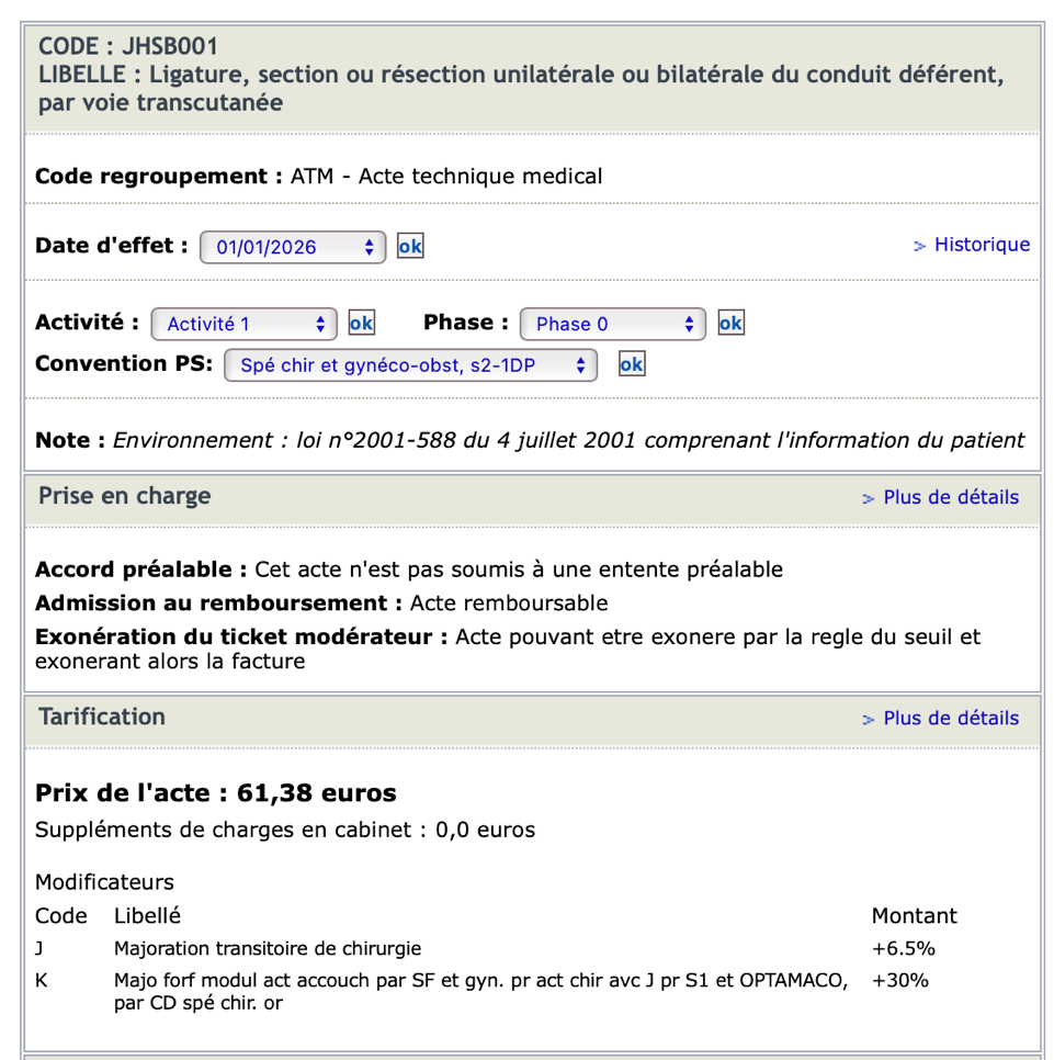 - JHSB001 est souvent interprété comme un acte technique médical isolé (ATM), du fait de sa réalisation possible en contexte externe ou en cabinet.